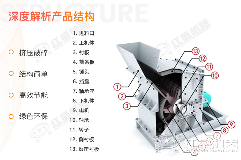 紅星細(xì)碎機(jī)是連續(xù)作業(yè)式設(shè)備,運(yùn)行性能穩(wěn)定可靠,工藝簡化,結(jié)構(gòu)簡單,維修方便,生產(chǎn)能力大,錘頭使用壽命長,廣泛適用于花崗巖,玄武巖,石灰?guī)r,河卵石,水泥熟料,石英石,鐵礦石,鋁礬土等多種礦物的細(xì)式破碎。
